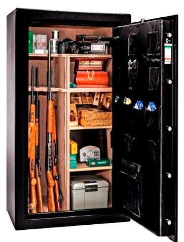 The FGS-592320 is a fireproof rifle safe with capacity for 24 guns. Features a digital lock with emergency key, five-spoke handle, carpet-lined interior, and adjustable shelves.